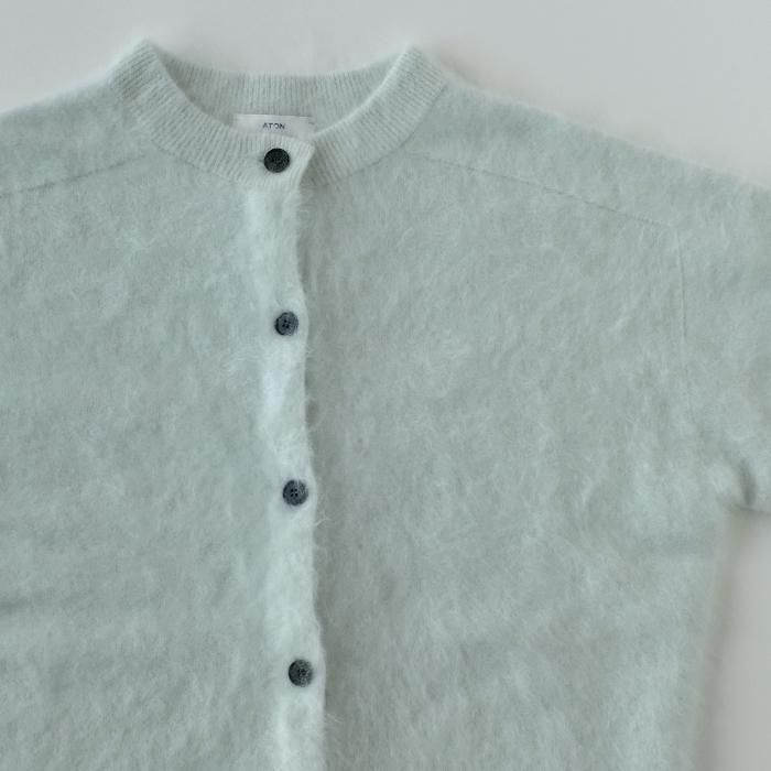 襟ぐりが高めのカシミヤカーディガン。